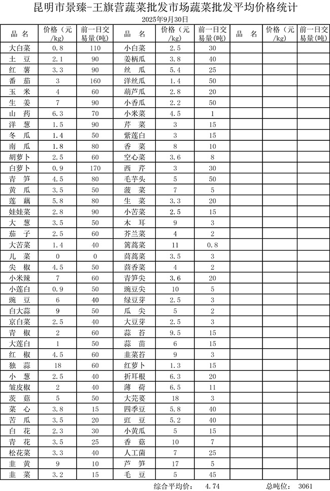 • 市场平均价格统计2025年9月30日