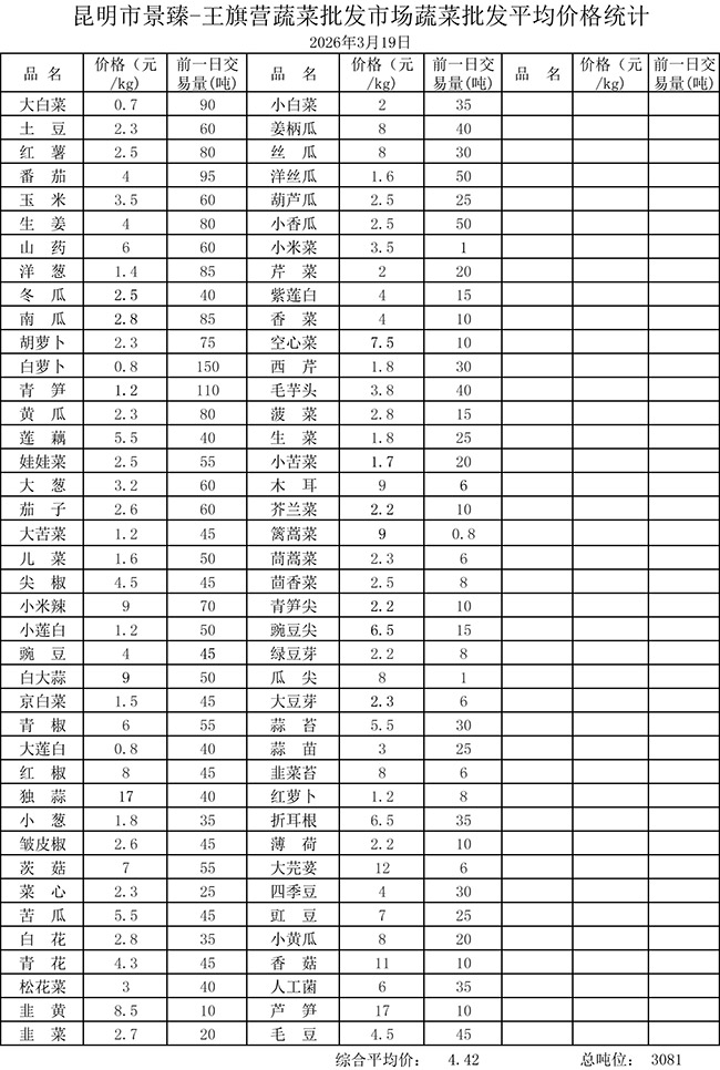 • 市场平均价格统计2026年3月19日