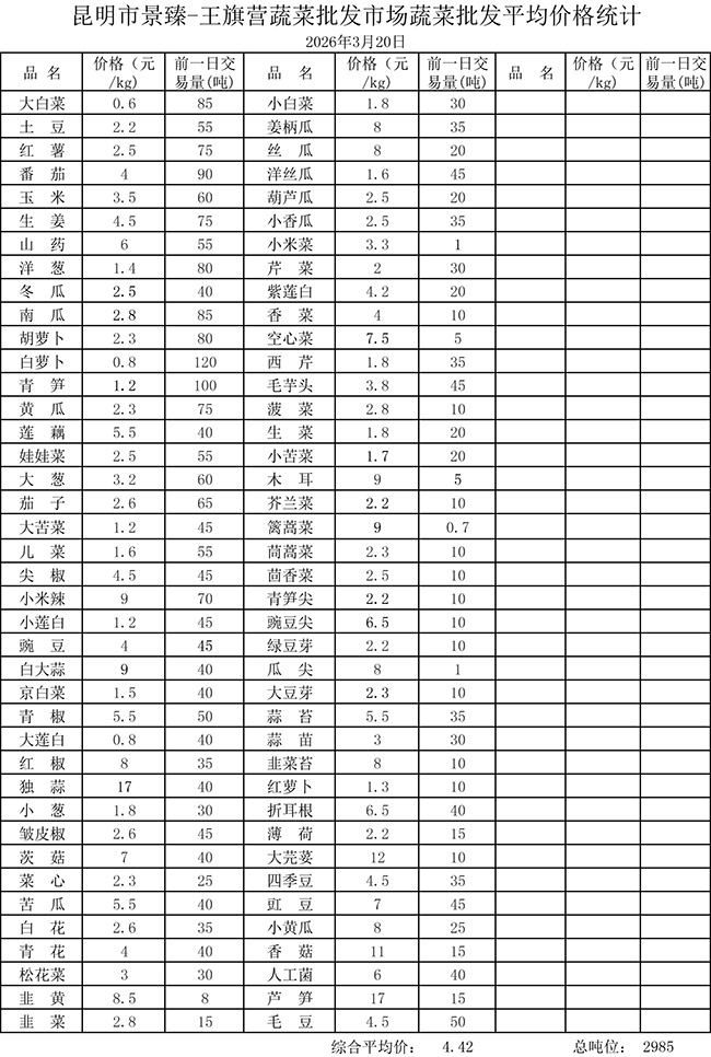 • 市场平均价格统计2026年3月20日