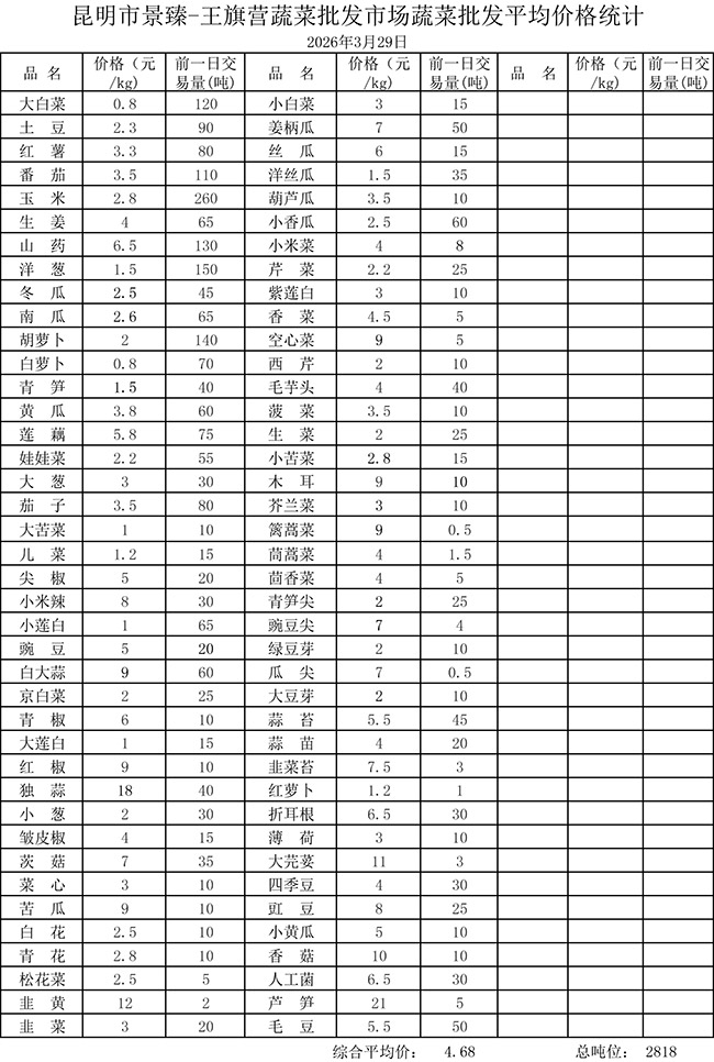 • 市场平均价格统计2026年3月29日