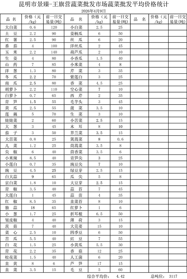 • 市场平均价格统计2026年4月9日