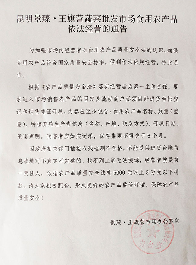 在做好疫情防控的同时,景臻·王旗营同时也保障更多新鲜蔬菜及时、充足供应市场,稳定昆明蔬菜价格;做好食品安全登记、确保舌尖上的安全。并要求进入市场销售农产品的固定及流动商户必须做好进货台帐登记和销售凭证开具,为保护人民健康安全献出一份力。