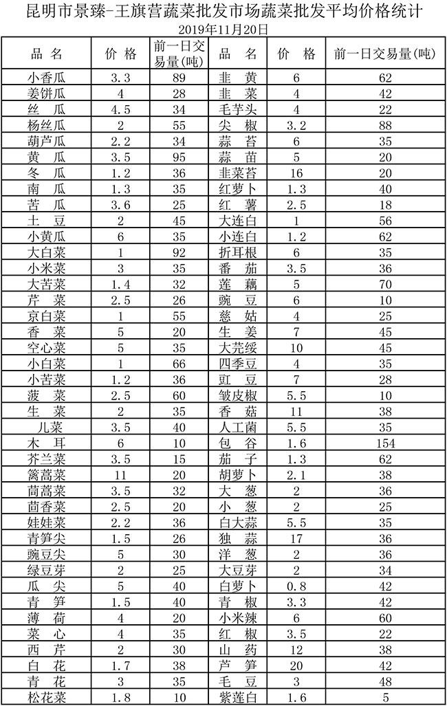 • 昆明景臻·王旗营蔬菜批发市场平均价格统计2019年11月20日