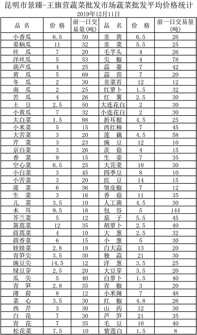 • 昆明景臻·王旗营蔬菜批发市场平均价格统计2019年12月11日
