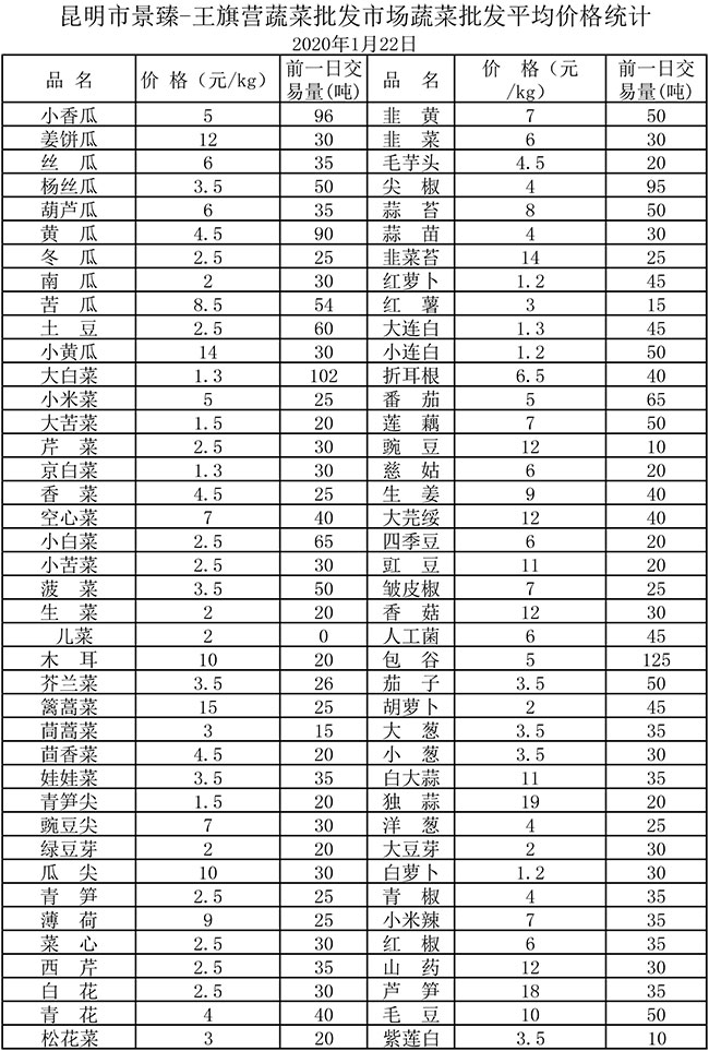 • 昆明景臻·王旗营蔬菜批发市场平均价格统计2020年1月22日