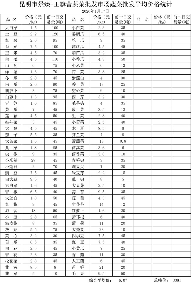 • 市场平均价格统计2026年1月17日