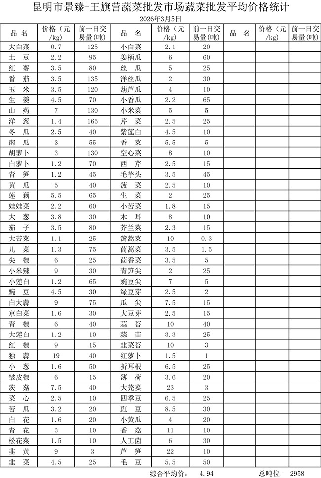 • 市场平均价格统计2026年3月5日